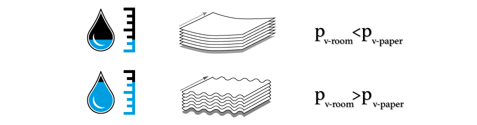 Paper is mainly composed of cellulose, meaning it is an intrinsically hygroscopic material and consequently maintaining a suitable moisture content (5-8%) is fundamental for preserving the desired workability and quality. If the relative humidity of the air is not properly controlled, direct and extended contact of paper with the air will negatively affect its characteristics. The difference in partial pressures between the moisture content of the paper and the humidity of the air tends to balance naturally, in accordance with the principles of physics. As a result, paper either absorbs from or gives off moisture to the surrounding air, causing a decline in its characteristics.