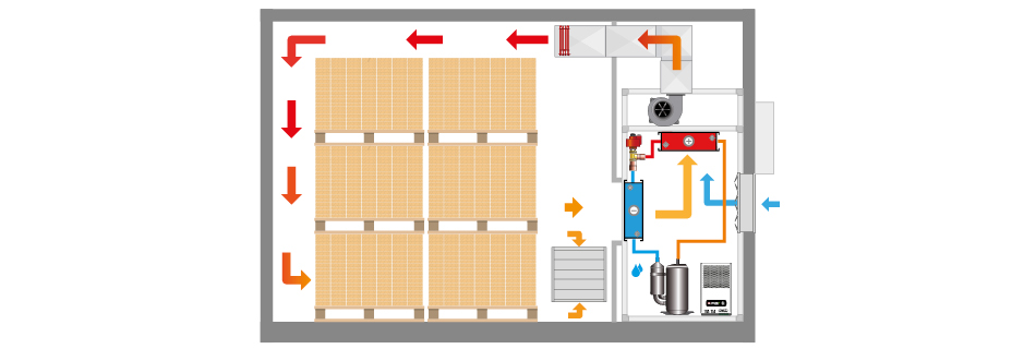 The heat pump uses a cooling coil to remove heat and humidity from the air, condensing the water vapour and expelling it. The recovered heat is then transferred to the heating coil, which generates a flow of hot, dry air, ideal for drying. The air is recirculated and high air change volumes are not needed, as in traditional dryers.