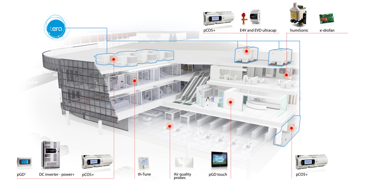 One important aspect regarding commercial buildings is high electricty consumption. For this reason, another distinctive feature of CAREL's offering is the continuous technological innovation to integrate into your own system, high-efficiency devices such as electronic expansion valves, and drivers for brushless variable speed compressors, which are elements of fundamental importance for achieving high energy efficiency applications in the services sector and minimising environmental impact.