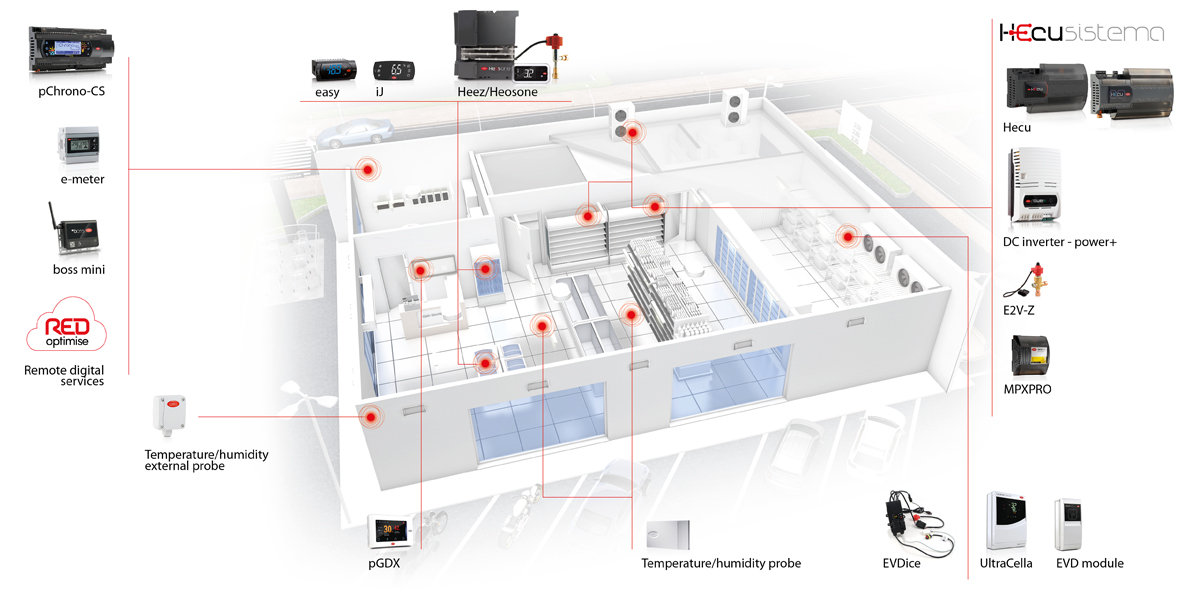 Choosing Carel for complete management of small shops, such as convenience stores, means: