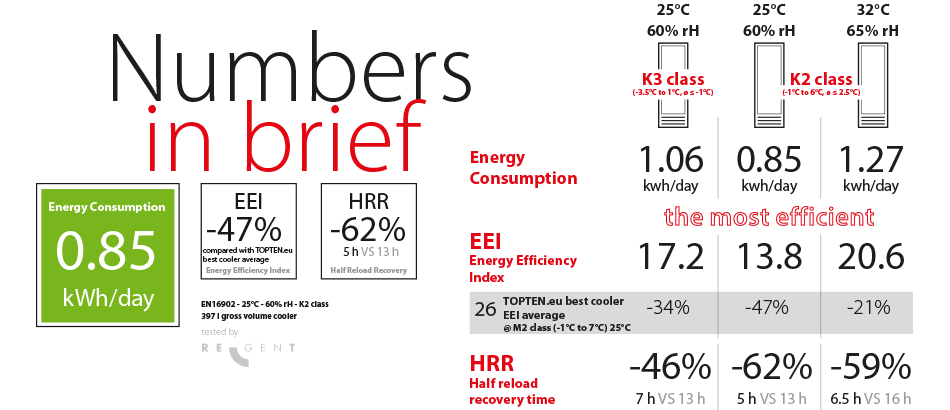 All of these features have made it possible to achieve incredible results in pull-down performance and energy consumption. Tests conducted by a certified third-party laboratory have shown that the Heez control solution installed on a glass door merchandiser can reach an EEI (Energy Efficiency Index) of 13.8, meaning 50% better efficiency than the best beverage coolers available on the market.