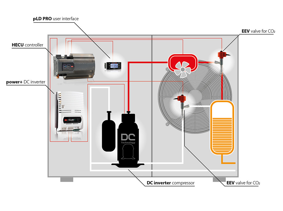 Hecu sistema is the CAREL high efficiency solution for condensing unit for commercial refrigeration. It has now evolved to work with natural refrigerants by integrating management of DC inverter compressors for CO2 refrigerant.