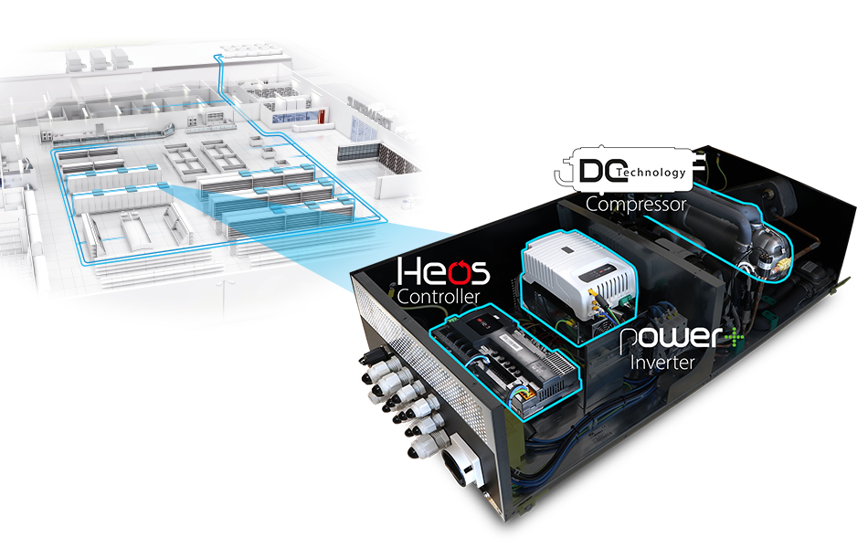 Maximum efficiency: The decentralised approach and continuous modulation make it possible to adapt operation perfectly to the demands of the showcase in all conditions. |