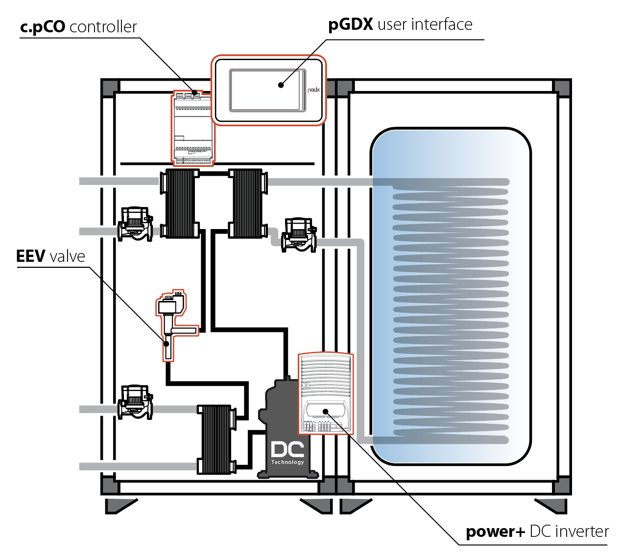 We have developed a complete platform for the management of advanced units, so as to fulfil current market requests for energy saving and better performance. The software can be used as-is to let any manufacturer quickly create and start-up an efficient heat pump. The flexibility of the c.pco control platform allows our customers to adapt our control system, in a few easy steps, to their envisaged unit layout.