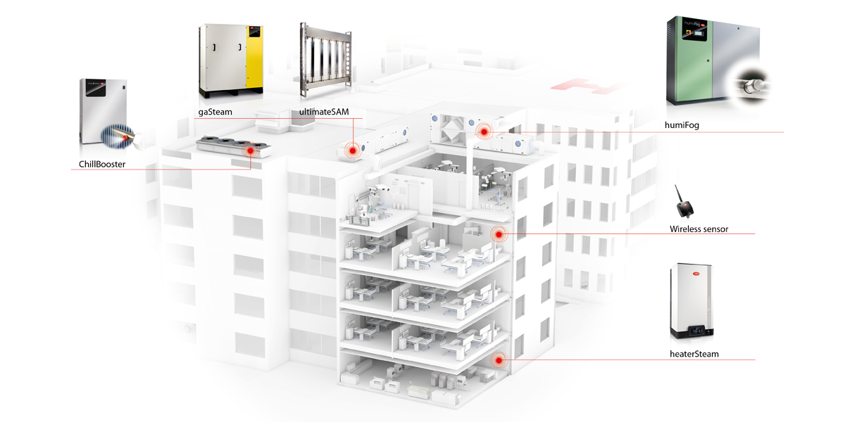 Low air humidity affects both health and well being of people. During the wintertime, the air inside buildings is heated to a temperature of 20-25°C with the consequence that relative humidity decreases to values of 10-30%, which is perceived as dry air, even if there is fog outside. The dry air favours thenevaporation of water from the skin, which cracks and causes dryness of the throat and nose and the respiratory tract etc. favouring the onset of typical winter illnesses. It is for this reason that air-conditioning systems that control both temperature and humidity of the air are used in hospital wards; the latter being maintained not too low but also not too high.To prevent propagation and proliferation of biological contaminants, the humidity should ideally be kept between 40% to 60%R.H. Accurate control of the humidity also contributes to protecting the electronic equipment from electrostatic discharges, making the hospital safer for staff and visitors and protecting the health of the patient at the same time. Dry air in the winter increases the dust in the air deriving from pieces of material and particles of skin that people lose. This causes problems for persons with allergies or asthma, which can be reduced by a correct level of humidity in the air. According to European Directive 2002/91/ EC, EN ISO 13790:2008, EN 13779:2008 VDI 6022, DIN 1946-4, Italian Presidential Decree dated 14 January 1997, UNI11425 (just to mention a few) ventilation and air-conditioning systems in operating theatres must ensure ideal temperaturehumidity conditions for the work of doctors, also considering the patient's needs. The humidification systems must be designed in a way not to contribute to the production and spread of contaminants, be easy to access, clean and control. Emphasis is given to continuity of service, in particular in operating theatres: humidifiers are used that guarantee operating continuity and "do not stop" for maintenance. Accurate humidity control is therefore not only an accessory, but a legal requirement.