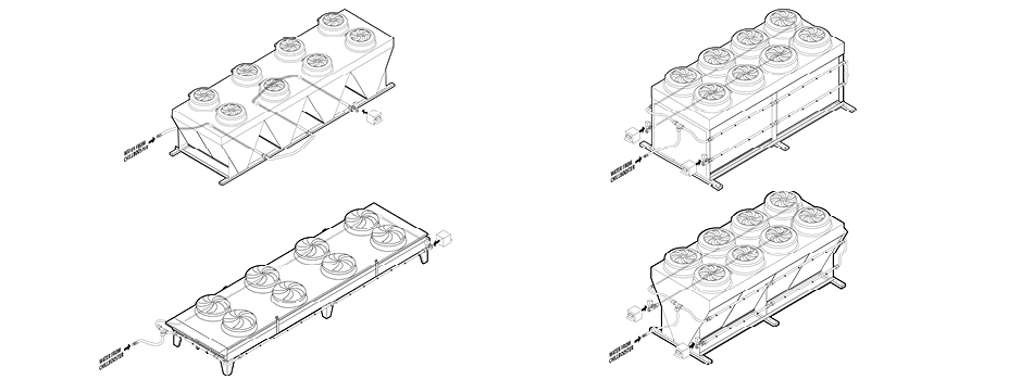 The cabinet has been designed to also be installed outdoors near the fluid cooler, while the extreme flexibility of the distribution system makes chillBooster suitable for any shape of coil. Vertical, horizontal, “V” or “W”; all four sides or some sides only, it makes no difference: chillBooster offers a solution in every scenario to fully meet the system requirements.