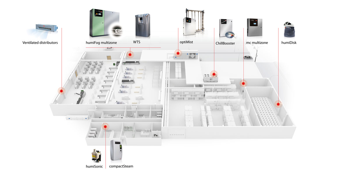 Keeping the relative humidity of the air within 50-60% allows you to limit the deformation and rippling of the sheets of paper and eliminate the accumulation of electrostatic charges, thus limiting waste and guaranteeing a constant productivity.