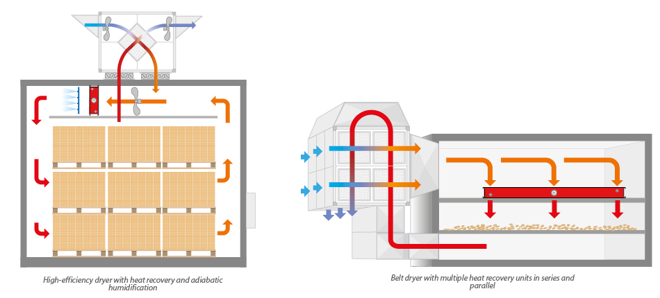 A traditional dryer heats air to high temperatures to help moisture evaporate from the wood. The humid released by the wood is then expelled and replaced with dry outside air. This process is energy-intensive, however it can be made more efficient using heat recovery units, modulating fans and thermally-insulated dampers, significantly reducing energy consumption.